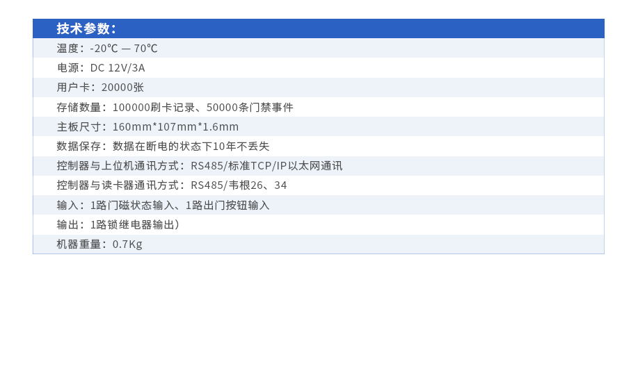 2路獨立韋根讀頭,支持標準的韋根26/34讀頭 支持IC卡、ID卡、S50卡、S70卡、HID卡、CPU卡、RF-SIM/RF-UIM手機卡、人臉識別、指紋識別 支持消防聯動報警、電子地圖、訪客聯動功能 支持脅迫報警、非法卡報警、非法闖入等報警事件 支持USB接口下發用戶檔案,回收刷卡記錄;支持10位拔碼 電源輸入帶有過電壓、過電流等保護設計 靈活的權限管理、開門方式(刷卡、卡+密碼、密碼、按鈕等)及開門時間設置 系